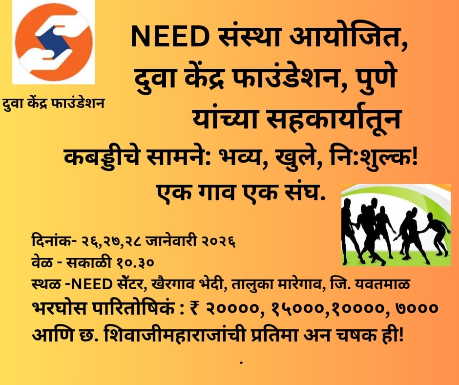 Youth in rural areas have fantastic sports skills which are often neglected. They hardly get an opportunity to exhibit their sport skills. NEED is an organization working in remote area of Yavatmal. Every year they conduct Kabaddi competitions in Khairgaon Bhedi , Maregaon. for rural and Trible youth from Yavatmal district. This year Duwa kendra Foundaiton joined hands with NEED to support this noble cause.